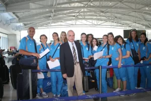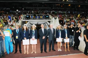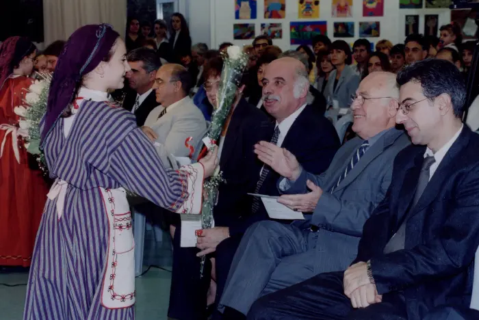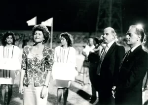 - Στιγμιότυπο από την τελετή έναρξης των πρώτων Αγώνων Μικρών Κρατών Ευρώπης (ΑΜΚΕ), που διοργανώθηκαν στην Κύπρο το 1989. Διακρίνονται επίσης η Αντρούλλα Βασιλείου και ο Κίκης Λαζαρίδης.